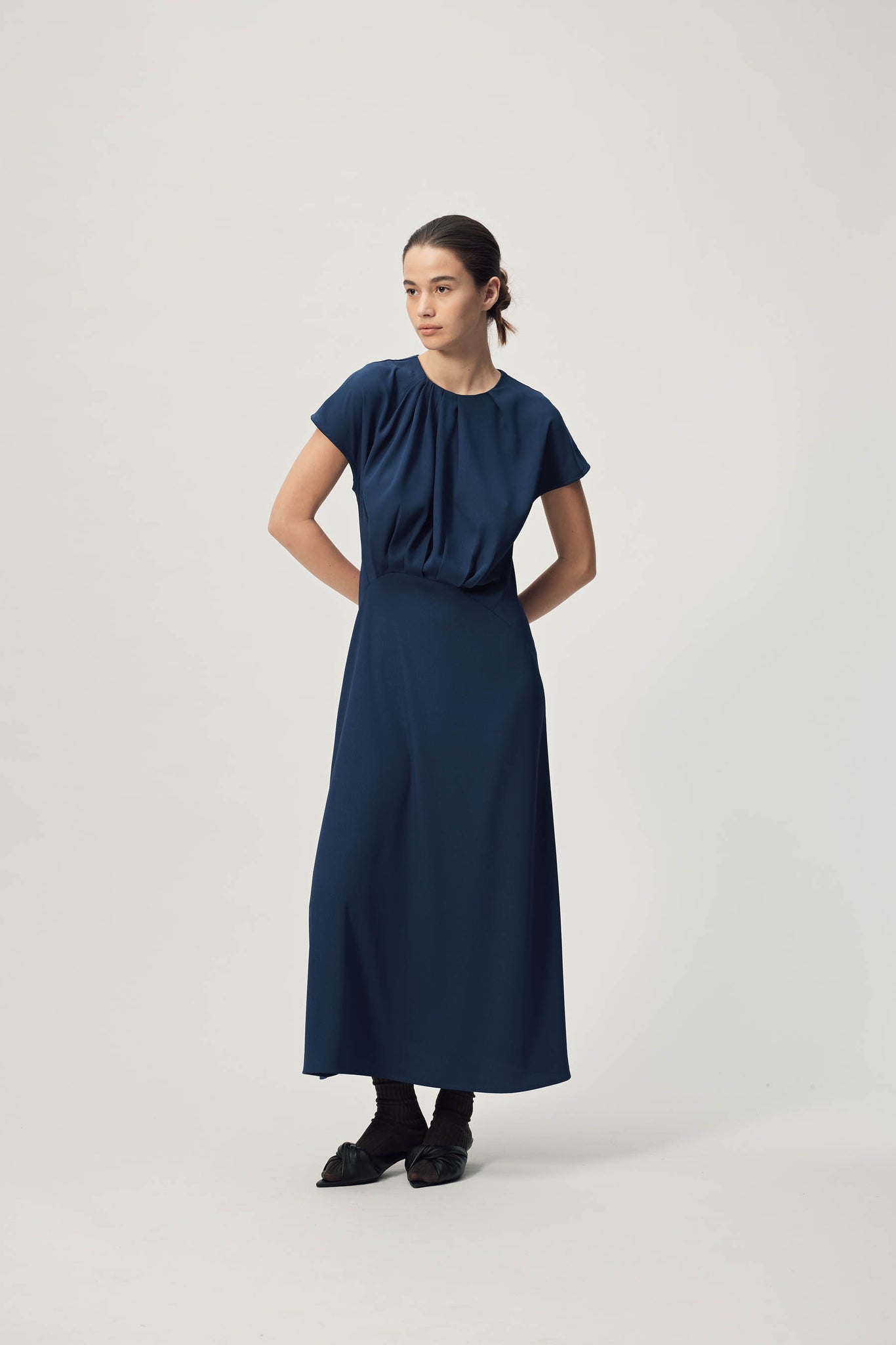 Expertly crafted in satin back crepe, the Julio Dress features delicate cap sleeves and elegant pleat detailing surrounding the neckline. Its curve-enhancing silhouette, completed by a curved front waist seam and mid-length skirt, is perfected by a convenient back zip fastening.