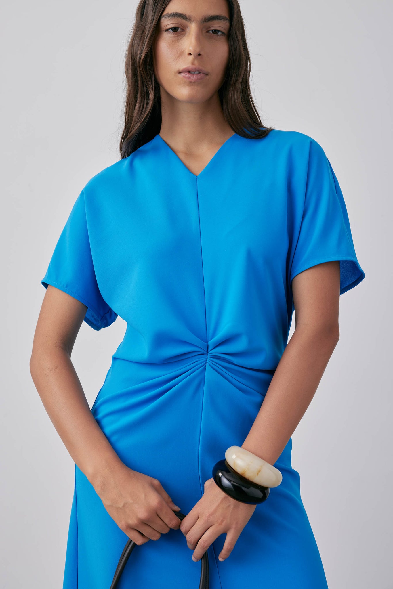 Experience understated elegance with the Dorienne Dress in Cerulean Blue. Made with luxurious Japanese polyester crepe, this streamlined piece features a gathered waist for a feminine touch. The high v neckline, tuck pleat detail, and invisible zip make it perfect for any occasion.