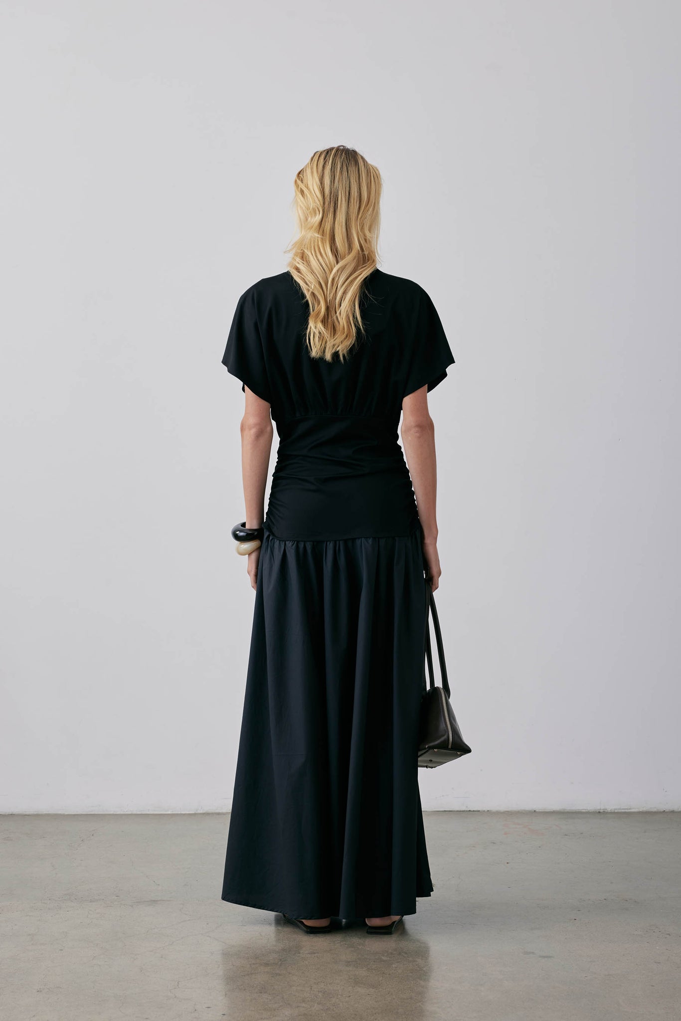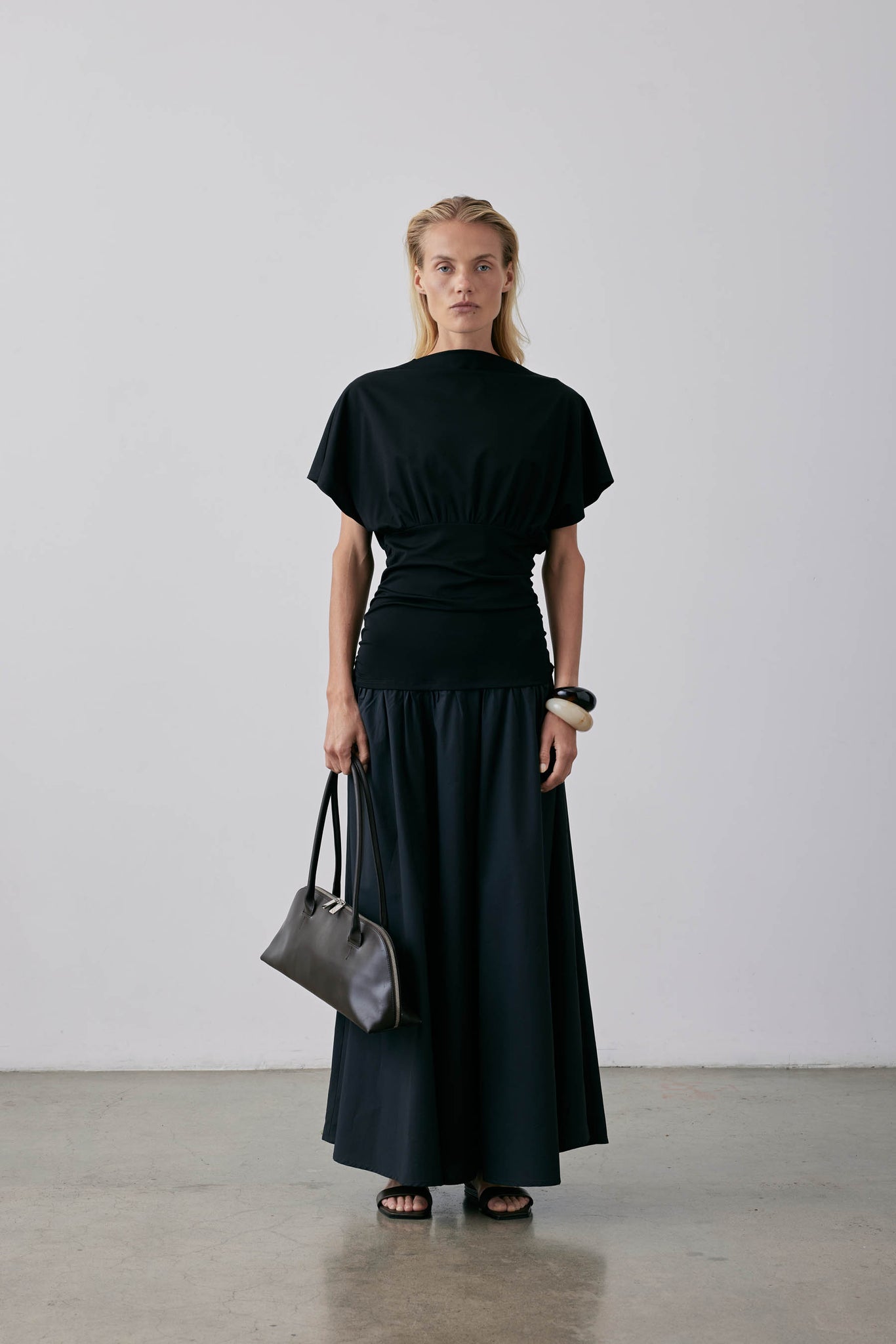 A knit top with a wide slash neckline & dolman sleeve with a full gathered skirt. A chic, high-quality piece from the Gregory collection. Made from a Japanese viscose knit fabric, this top features flattering side seam tucks at the waist, resulting in a subtle, flattering silhouette. The attached gathered cotton poplin skirt adds a touch of sophistication to this dress. Elevate your wardrobe with this versatile and elegant piece.