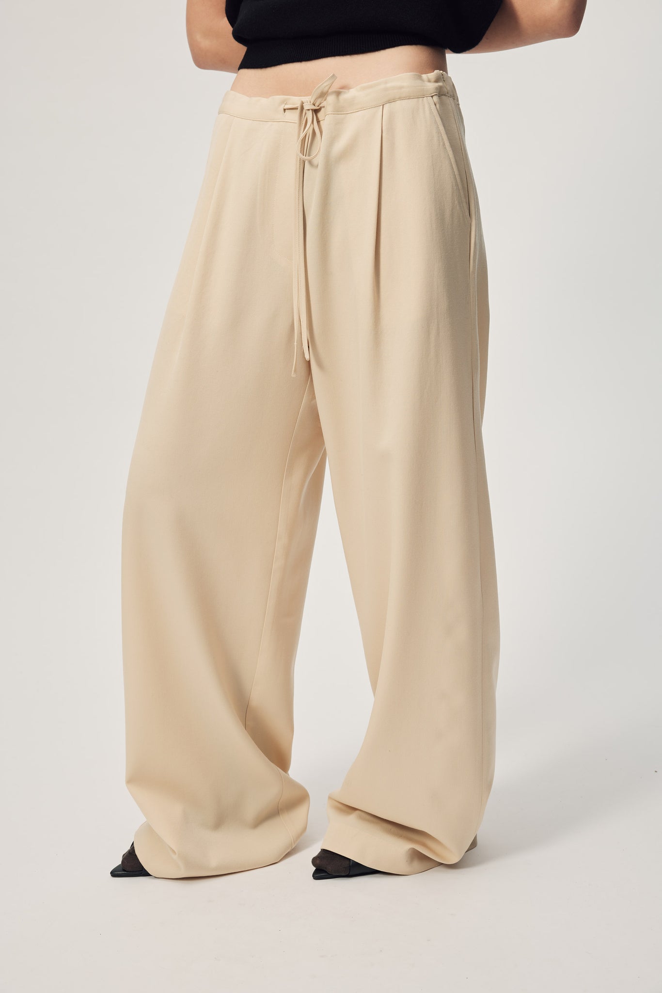 Crafted from premium wool in a serene Jasmine hue, the Bayard Pant delivers understated elegance with practical comfort. The refined waistband features self-ties that elevate the silhouette, while the generous wide-leg cut ensures an unstructured, breathable drape ideal for layering and movement. A versatile essential that transitions seamlessly from day to evening, these pants embody the art of effortless dressing without compromising on quality or sophistication.