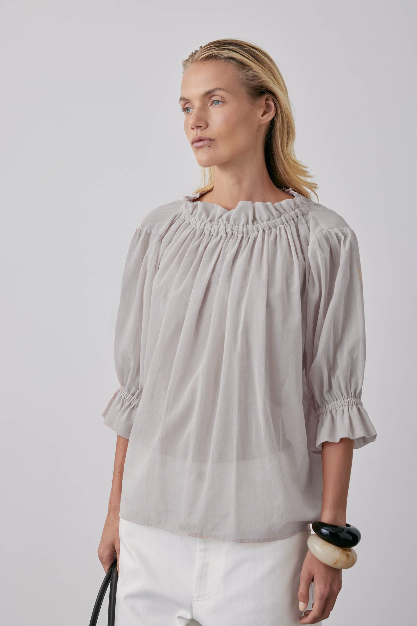 A short-sleeved blouse crafted from soft Japanese cotton in Soft Pink. The delicate fabric ensures a luxurious feel against the skin. This blouse features a fine elastic channel at the neck and sleeves, creating a gathered volume that adds a touch of feminine charm. Elevate your everyday look with the Peddle Top, a timeless addition to your wardrobe.