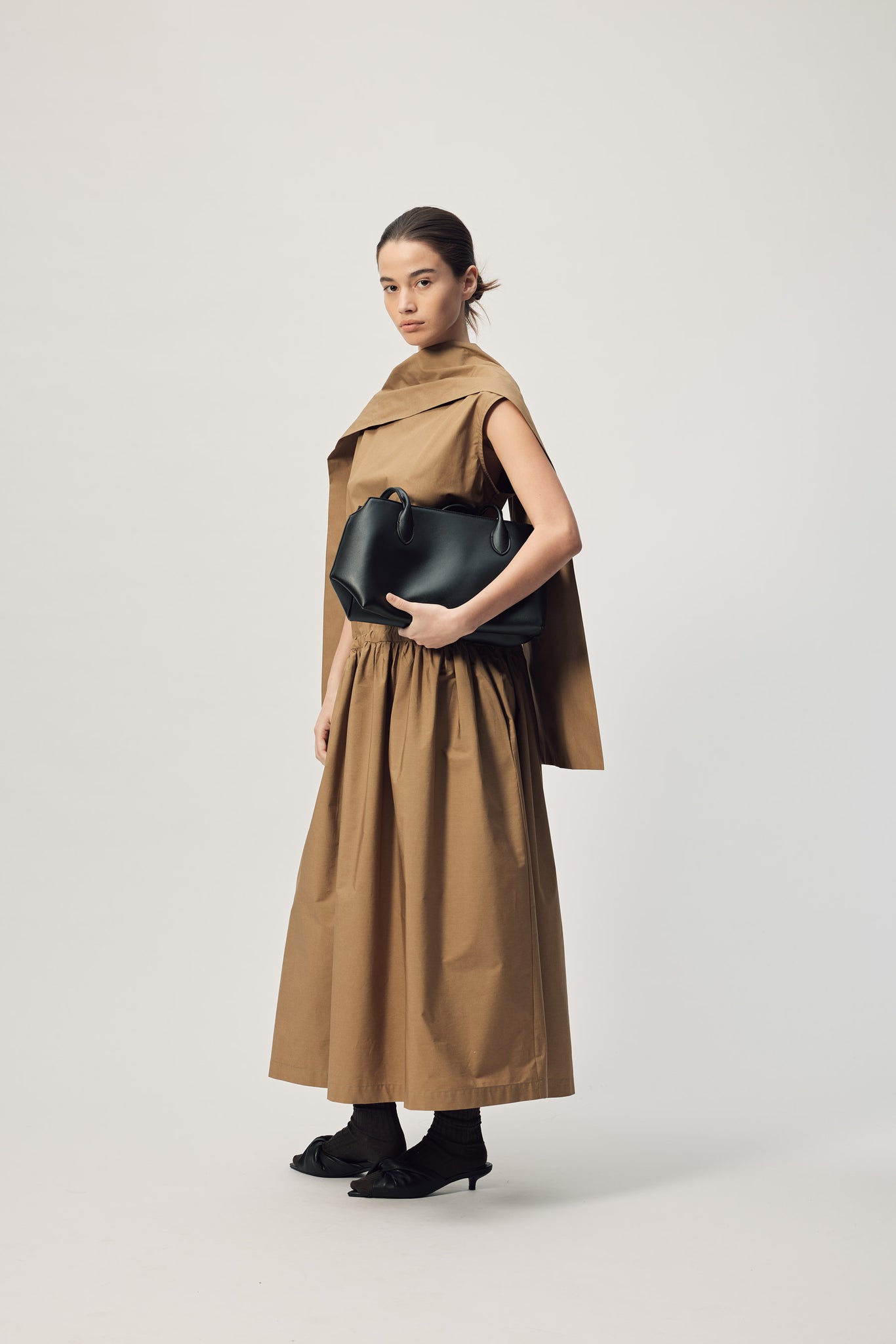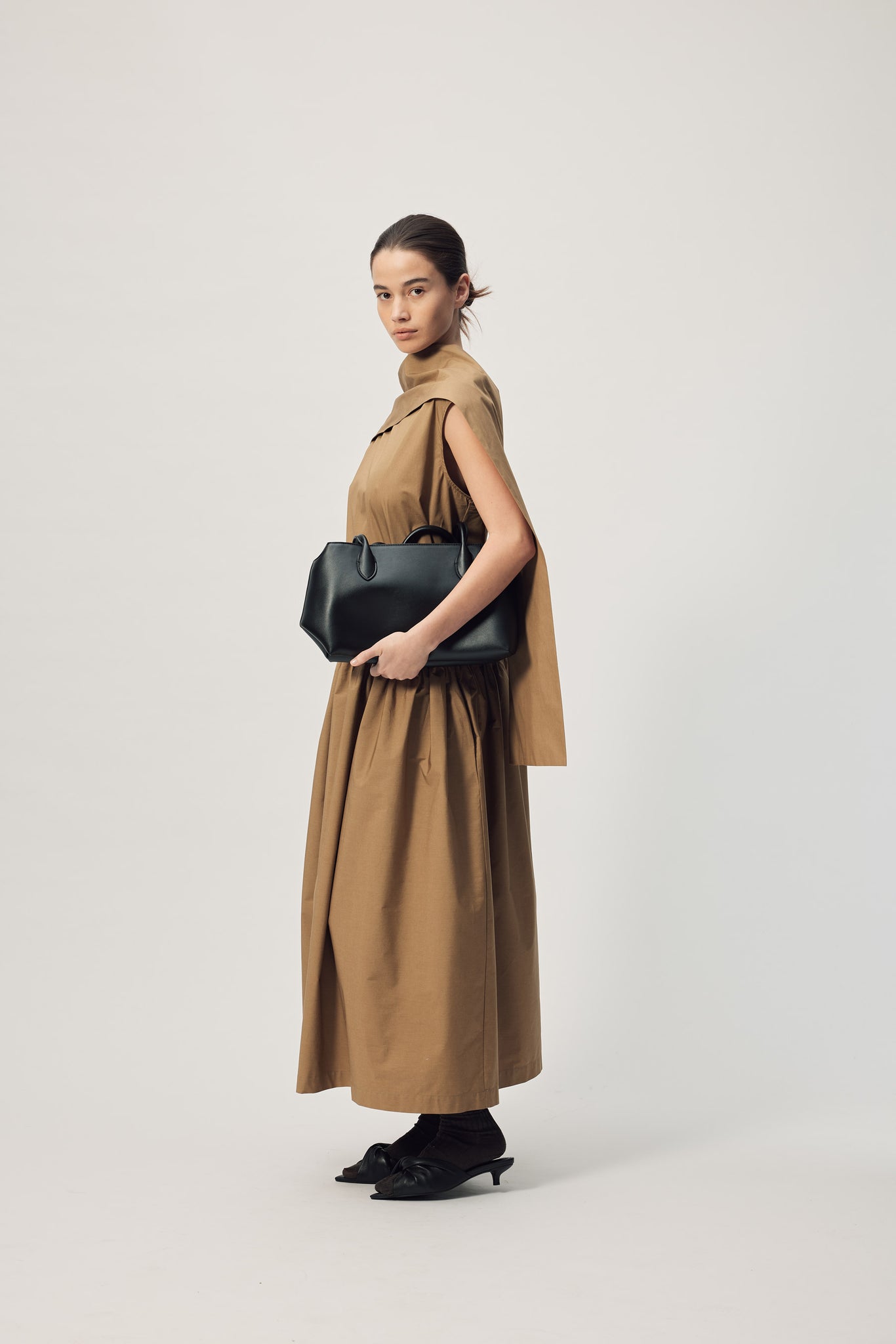 The Dillan Dress SS25 features a crisp tobacco cotton. Its elegant scarf neckline and cap sleeves create a refined silhouette, while the gathered skirt adds subtle volume and movement. This dress combines comfort with sophisticated design, making it an ideal choice for both casual and formal occasions.